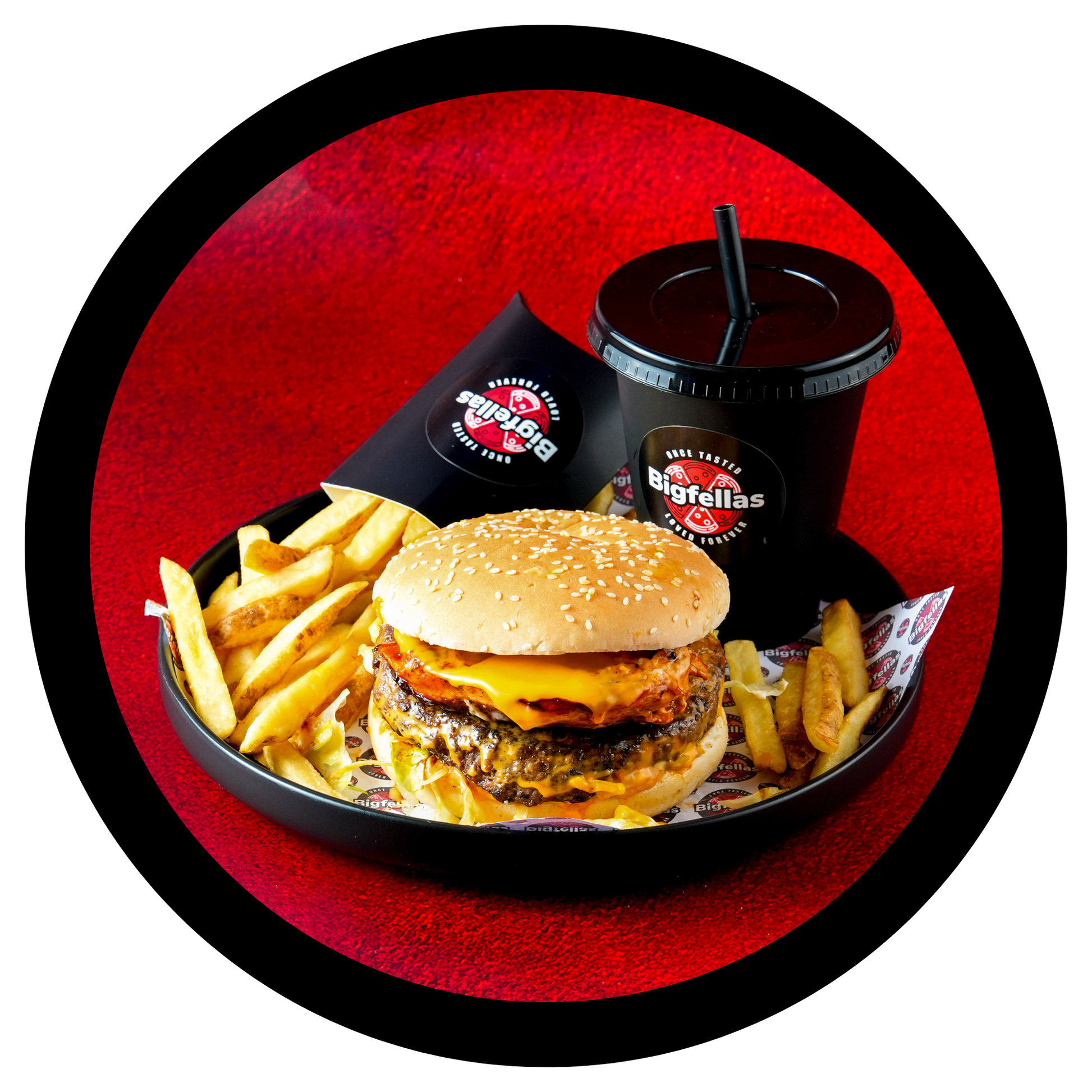 Smashed Angus Beef Patty, Flame Grilled Chicken Fillet, melted Cheese, onions, Lettuce, sauce, served in a Brioche Bun with Fries.