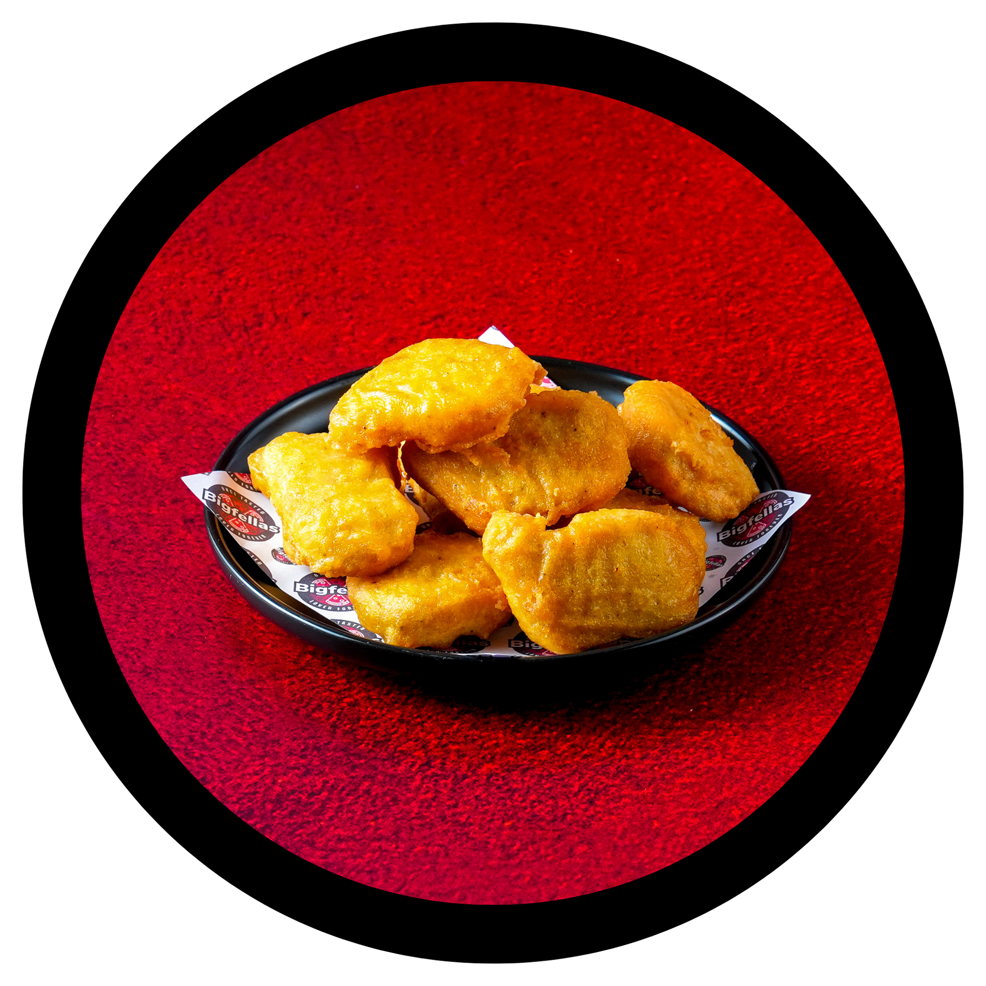 Nuggets. Chicken breast coated in golden batter served with fries.