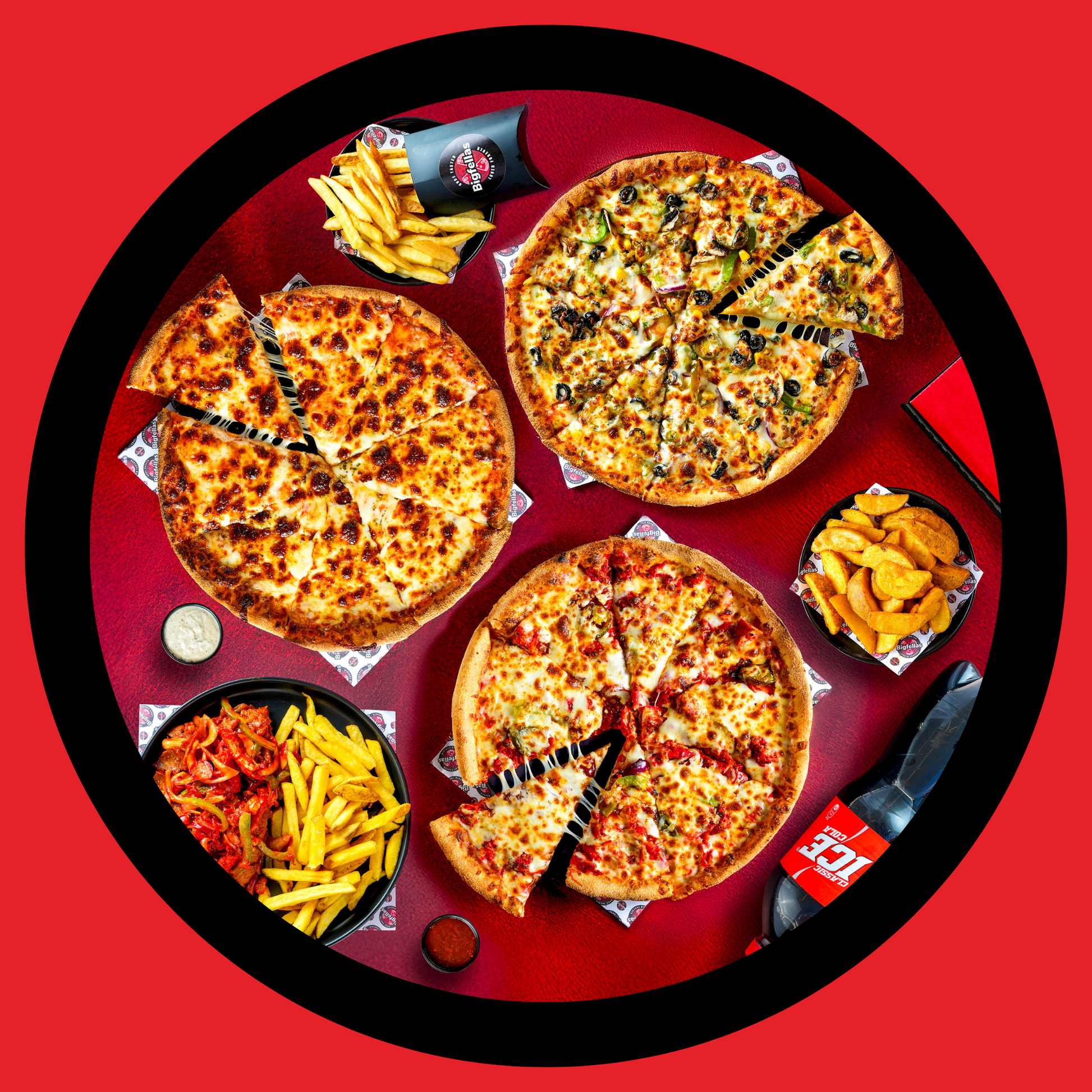 Two 16 Inches pizzas, 12 Inches garlic bread cheese or margherita, large stirfry donner, chips, one large fries, one large potato wedges, 1.5 litre coke bottle, and selection of all sauces.